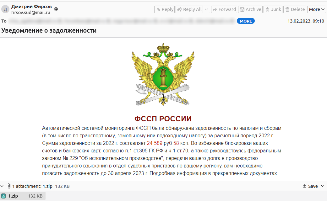 Специалисты F6 Threat Intelligence обнаружили похожее письмо с темой «Уведомление о задолженности», которое распространялось 13 февраля 2023 года с электронного адреса firsov[.]sud@mail.ru (рисунок ниже).
