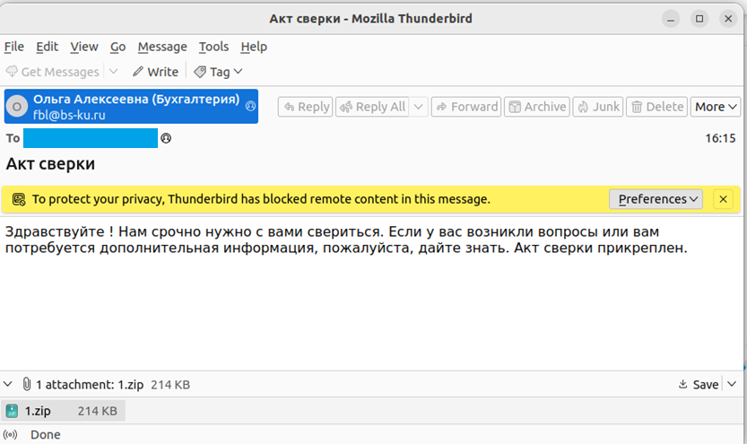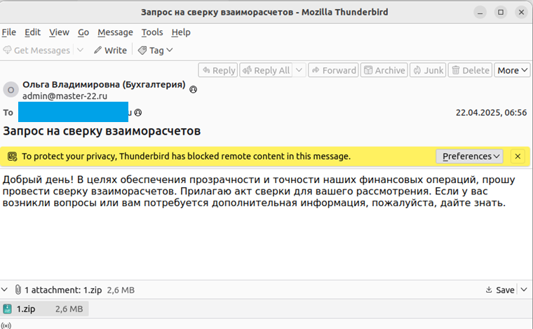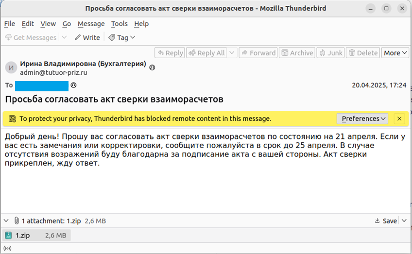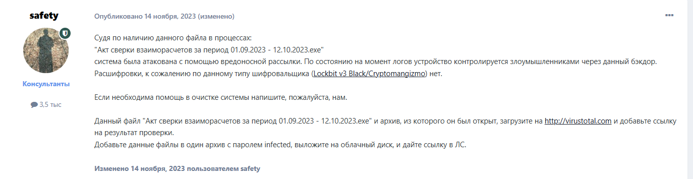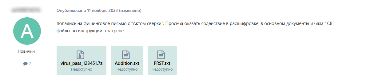В конце 2023 года стали появляться посты от жертв, чьи организации были зашифрованы после запуска вредоносных вложений из писем с темами «Акт сверки» (рисунки ниже).