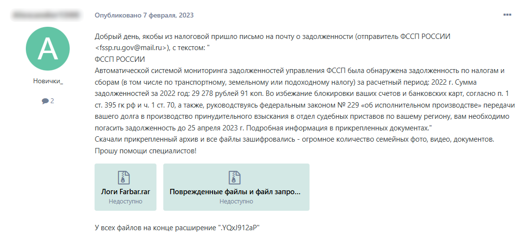 В конце января-начале февраля 2023 года на одном из форумов появляются посты жертв атак, которые мы атрибутируем группе room155, с просьбой о расшифровке. Согласно этим сообщениям, группа рассылала письма от имени ФССП. Примеры сообщений представлены на рисунках ниже.
