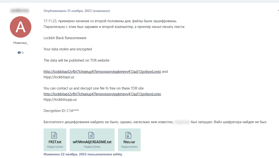 Затем один из пользователей опубликовал пост о том, что 17 декабря 2023 года его организация стала жертвой этой кампании, файлы были зашифрованы с расширением .wPJWmA6jf (рисунок ниже).