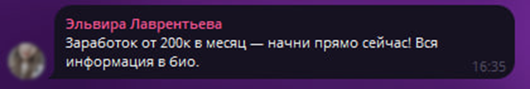 Предложения быстро и легко заработать много денег нередко оставляют в чате прямым текстом. Вот пример: «Заработок от 200к в месяц. Начни прямо сейчас», – и призывом перейти в профиль аккаунта. Ссылка в профиле ведёт на Telegram-канал с подробностями.