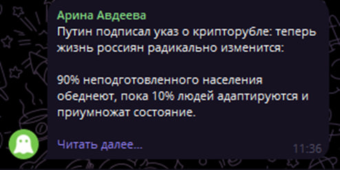 Типичный пример – на скринах. В комментарии к посту появляется сообщение о том, что глава государства якобы подписал «указ о крипторубле». Ссылка «Читать далее» из комментария уводит в фейковый Telegram-канал, в котором та же самая ложная информация подаётся с «подробностями» и ссылкой на другой Telegram-канал с «уроками» для криптоинвесторов.