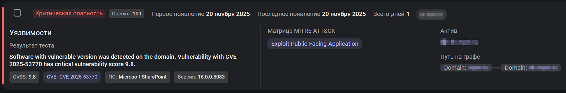 Когда уязвимости CVE-2025-53770 и CVE-2025-53771 перешли в стадию массовой эксплуатации, любая подозрительная активность вокруг SharePoint стала тревожным сигналом. Этой осенью команда аналитиков Центра кибербезопасности F6 (далее – ЦК F6) заметила тревожный сигнал — система F6 Attack Surface Management (далее – ASM) подняла проблему по активу у нового Заказчика, требующую немедленного внимания. Выявленный сигнал быстро трансформировался в полноценный инцидент безопасности с вовлечением аналитиков для локализации и нейтрализации угрозы.