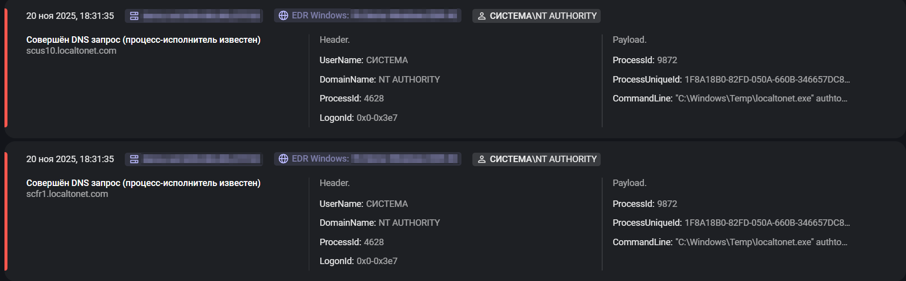 В ходе анализа телеметрии были отмечены события с высоким уровнем критичности: с задействованного сервера осуществляются коммуникации к домену localtonet[.]com от процесса-исполнителя C:\Windows\Temp\localtonet.exe, что свидетельствует о работе популярной у злоумышленников утилиты, предназначенной для создания сетевых туннелей.