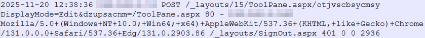 При анализе криминалистически значимой информации, собранной на начальном этапе исследования, аналитики ЦК F6 первым делом начали изучать логи веб-сервера Microsoft IIS. В ходе этого исследования был обнаружен характерный POST-запрос 20 ноября 2025 года в 15:38, свидетельствующий об эксплуатации уязвимостей CVE-2025-53770 и CVE-2025-53771.