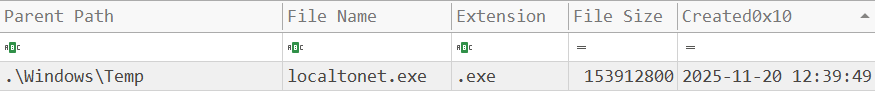Далее перед командой аналитиков ЦК F6 стояла задача определить, когда утилита Localtonet была доставлена на сервер. Для этого была проанализирована файловая таблица MFT, где удалось выявить артефакты, связанные с появлением утилиты на диске. Согласно записям в MFT, утилита была создана на сервере 20 ноября 2025 года в 15:39.