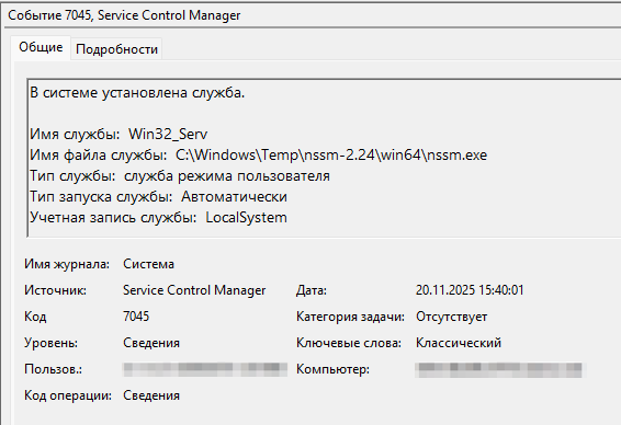 Следующим шагом необходимо проверить, имелись ли следы закрепления на сервере. Аналитики приступили к анализу журнала Windows System.evtx, сосредоточившись на событиях с идентификатором 7045, которые фиксируют факт создания службы в системе. Было обнаружено создание службы Win32_Serv в 15:40 с путем к исполняемому файлу C:\Windows\Temp\nssm-2.24\win64\nssm.exe.