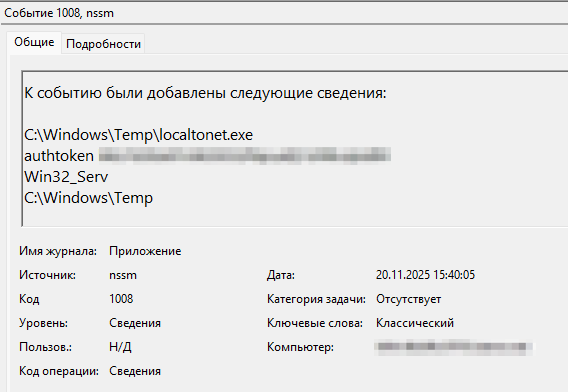 Чтобы выяснить, какое ПО запускалось через NSSM, необходимо было проанализировать журнал событий Application.evtx и события с идентификатором 1008, в которых указываются сведения о запускаемой программе, ее параметрах и связанных с ней службах. В одном из таких событий был обнаружен путь к исполняемому файлу утилиты Localtonet, что свидетельствовало об успешном закреплении злоумышленника на сервере. NSSM в этой конфигурации отвечал за корректное функционирование Localtonet в качестве системной службы. Таким образом, NSSM использовался злоумышленником как инструмент для обеспечения устойчивого канала удаленного доступа к скомпрометированному серверу.