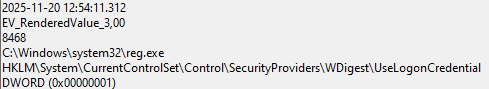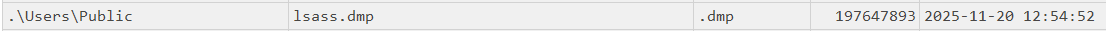 Также злоумышленники исполнили команду, связанную с изменением параметра реестра, после чего в Windows пароль пользователя стал хранится в открытом виде в памяти процесса LSASS. Поскольку такой прием часто используется для последующего получения дампа LSASS и кражи учетных данных, аналитики ЦК F6 дополнительно проанализировали MFT на предмет появления соответствующих файлов. В результате в файловой таблице была найдена запись о файле lsass.dmp, находящемся в директории C:\Users\Public, что свидетельствует о том, что злоумышленники получили дамп процесса LSASS.