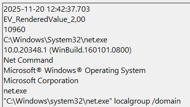 При дальнейшем анализе журнала событий Microsoft-Windows-Sysmon/Operational.evtx было обнаружено исполнение следующих команд по разведке: whoami, net user, net group, net localgroup и nltest. Данные команды дают возможность злоумышленнику получить информацию о текущем имени пользователя, учетных записях на задействованном устройстве, группах пользователей, а также позволяют проводить разведку на контроллере домена.