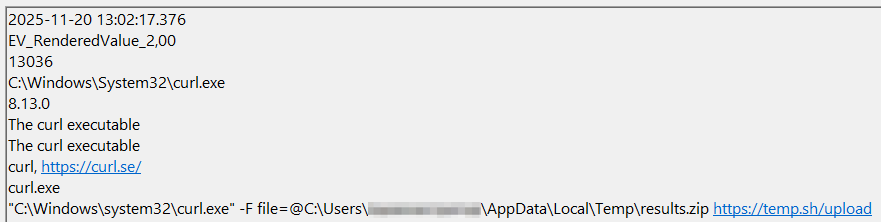 На заключительном этапе со стороны злоумышленников была осуществлена эксфильтрация полученной информации через файлообменник temp[.]sh. Этот ресурс приобрел популярность среди злоумышленников благодаря своей простоте и возможности анонимного хранения данных. Признаки эксфильтрации часто фиксируются в системных журналах Windows, и одним из таких индикаторов является событие, зафиксированное аналитиками ЦК F6 в журнале Microsoft-Windows-Sysmon/Operational.evtx. В данном случае, артефактом, указывающим на успешную эксфильтрацию, стало событие о загрузке архива results.zip на файлообменник.