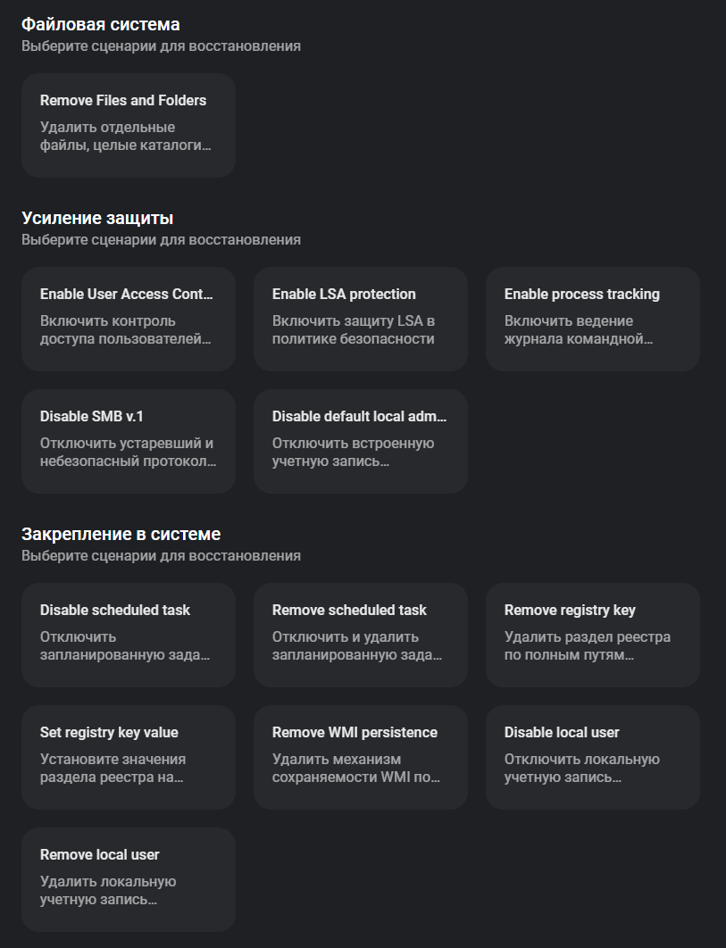 Рисунок 21. Сценарии восстановления, входящие в функционал EDR-агента