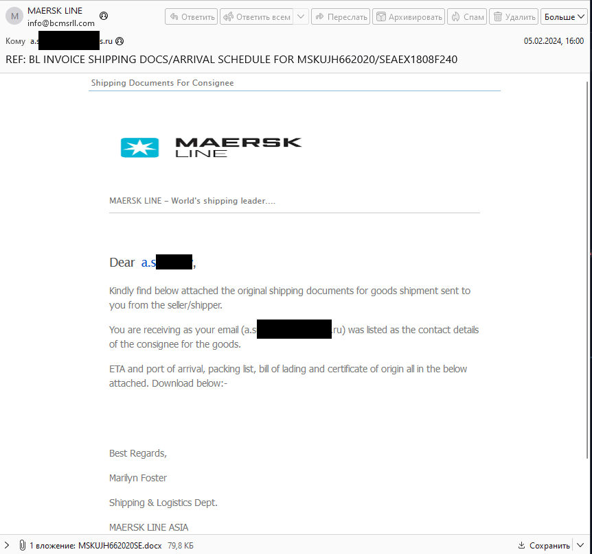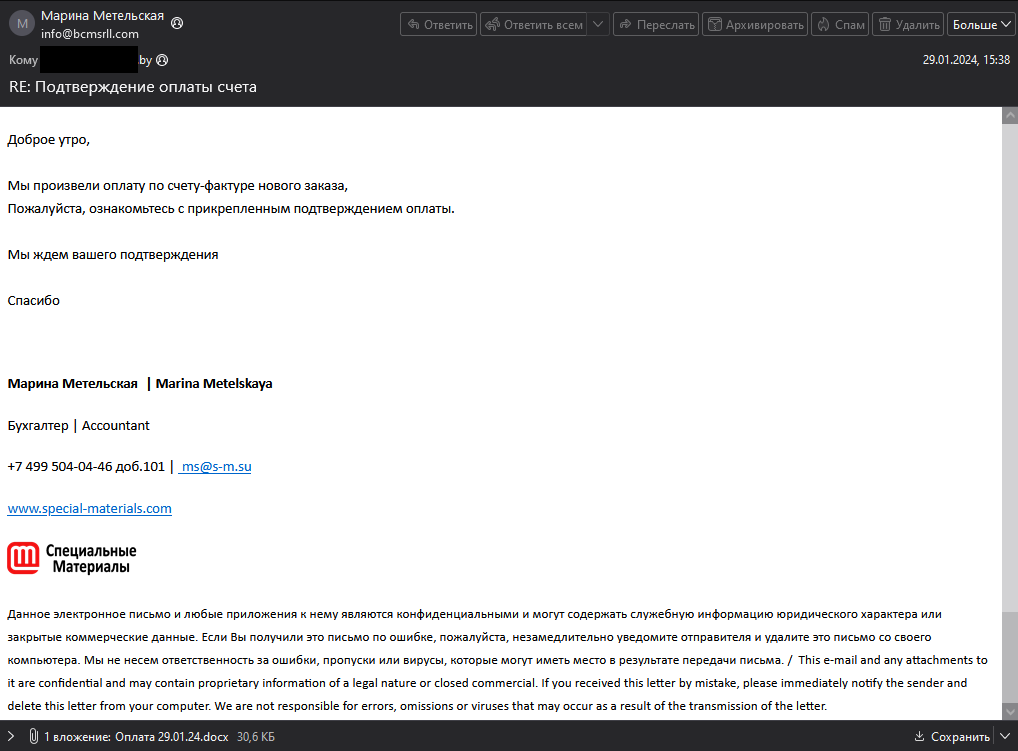 Так, с начала 2024 года системой F6 Managed XDR было перехвачено 202 фишинговых письма, направленных с адресов электронной почты export@bcmsrll[.]com, expo@bcmsrll[.]com, info@bcmsrll[.]com и contact@bcmsrll[.]com, созданных на указанном домене.