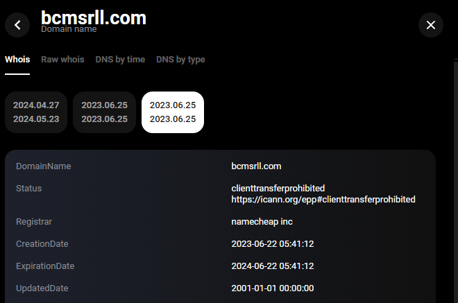 Изображение 1. Информация о доменном имени bcmsrll[.]com