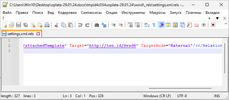 Изображение 6. Ссылка на внешний источник hxxp://tau[.]id/0vzd8, обнаруженная в файле «oplata-29.01.24.docx»