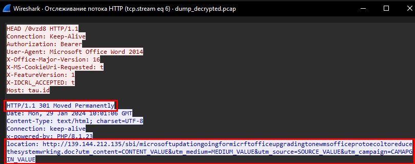 В случае запуска файла-вложения, формат которого был «.docx» или «.xls», происходил запуск макроса, посредством которого осуществлялось направление запроса к ресурсу hxxp://tau[.]id/0vzd8, информация о котором содержалась в теле файла.