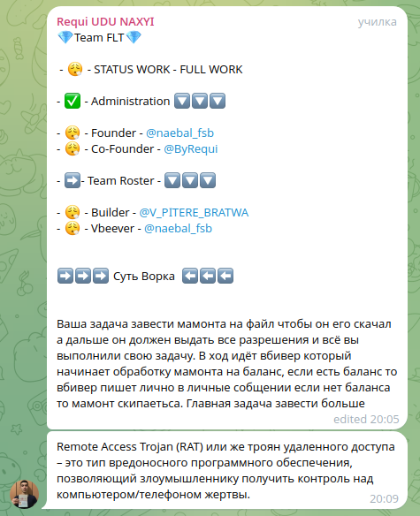 Рис: Пример объявления из скам-группы с описанием современной схемы атаки на мамонта с использованием ВПО