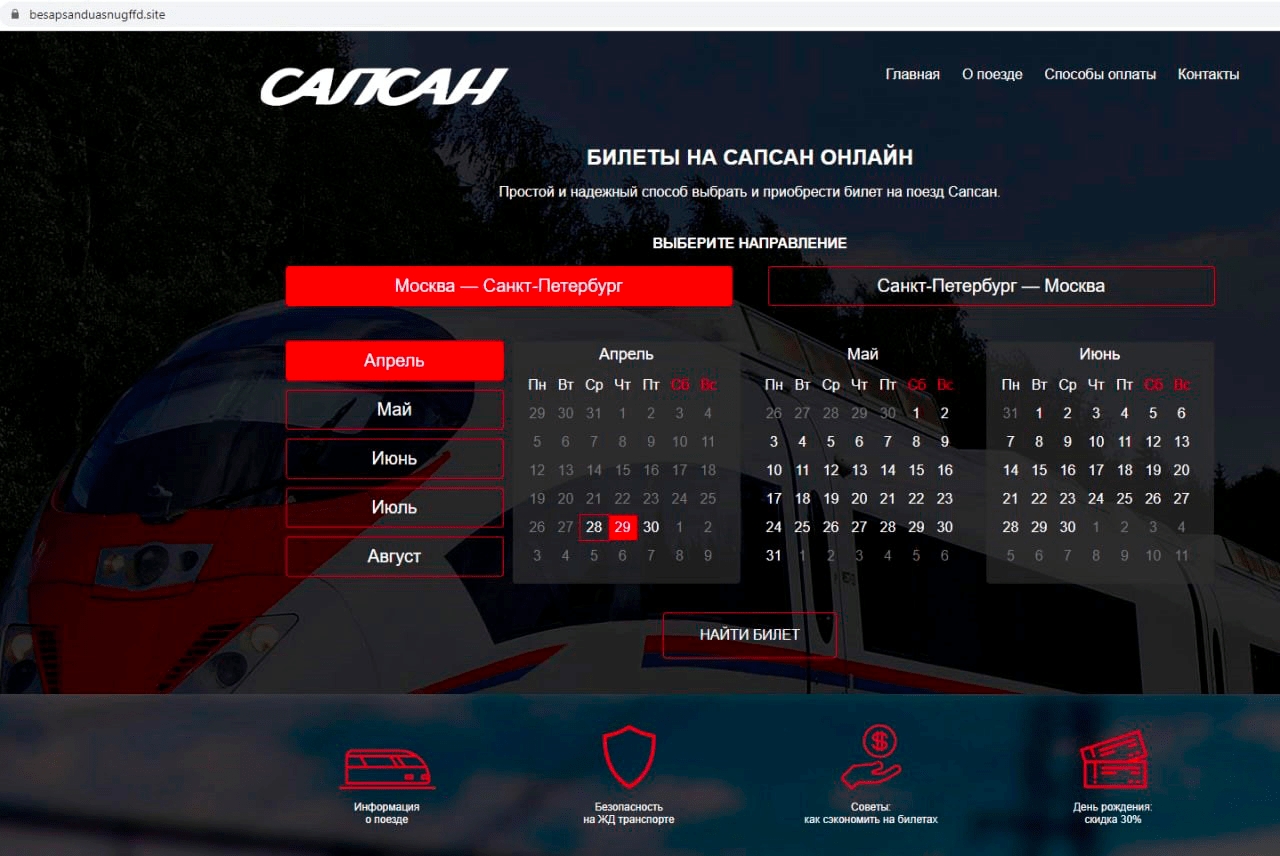 Накануне майских праздников Group-IB выявила фишинговую атаку на россиян: мошенники создали сеть фальшивых страниц по лже-продаже электронных билетов на поезд „Сапсан„, нацеленных на кражу денежных средств и платежных данных пользователей.