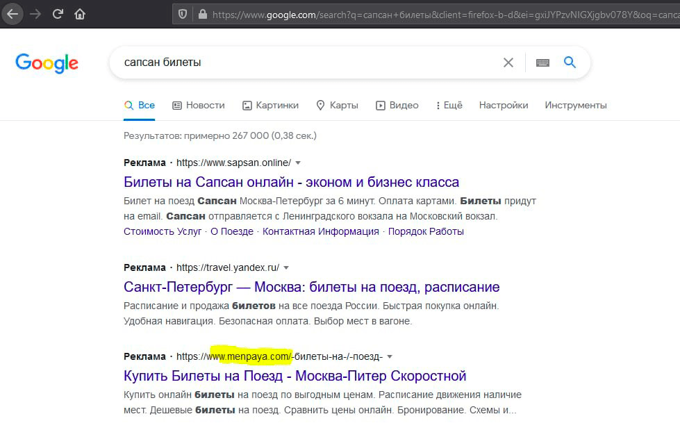 В схеме мошенничества был использован классический сценарий: в поисках доступных билетов на «Сапсан» жертва, привлеченная рекламой, попадала на сайт мошенников. При клике на рекламное объявление осуществлялся переход на фишинговые сайты. Все они были созданы с помощью IFrame — легитимного компонента HTML, который позволяет встраивать на свой веб-ресурс контент стороннего сайта. Желая приобрести билет онлайн, человек вводил данные банковской карты, в результате терял и деньги, и данные «пластика».