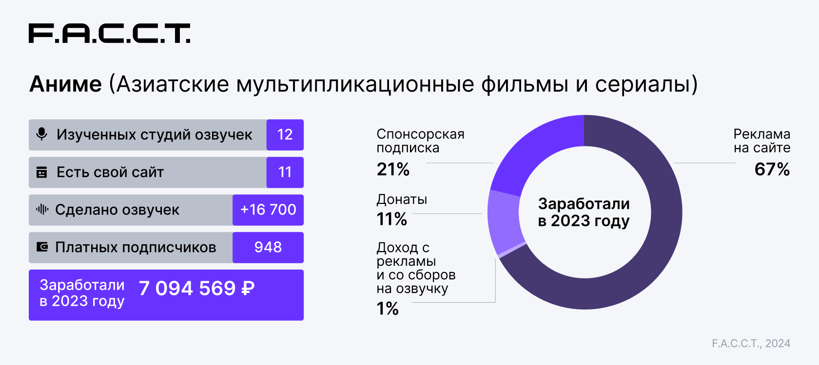Регулярные запреты на аниме-тайтлы и малое количество закупаемых лицензий на показ не покрывают высокий спрос на данный жанр у русскоязычной аудитории, поэтому студии неофициального озвучивания азиатской мультипликации очень востребованы. В среднем одна студия озвучила около 1400 аниме-фильмов и серий в 2023 году. Основной доход студий формируется за счет рекламы на сайтах, как баннерной, текстовой, так и в видеоплеерах. Почти у всех есть свой сайт.