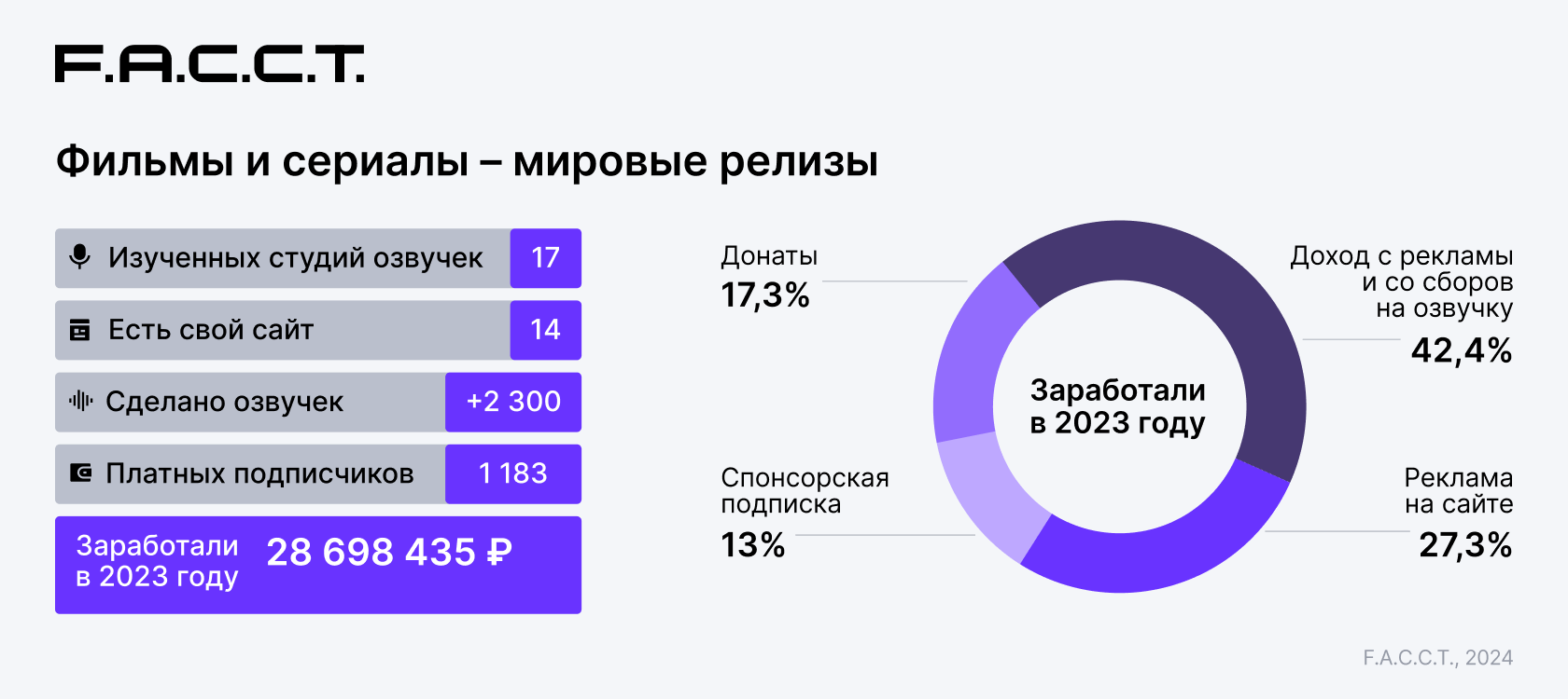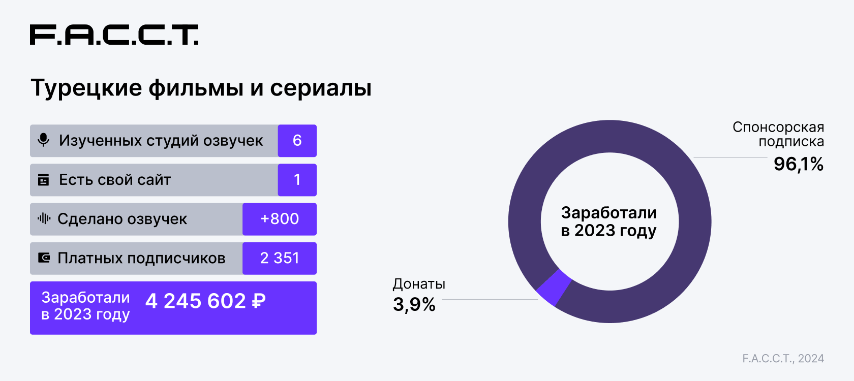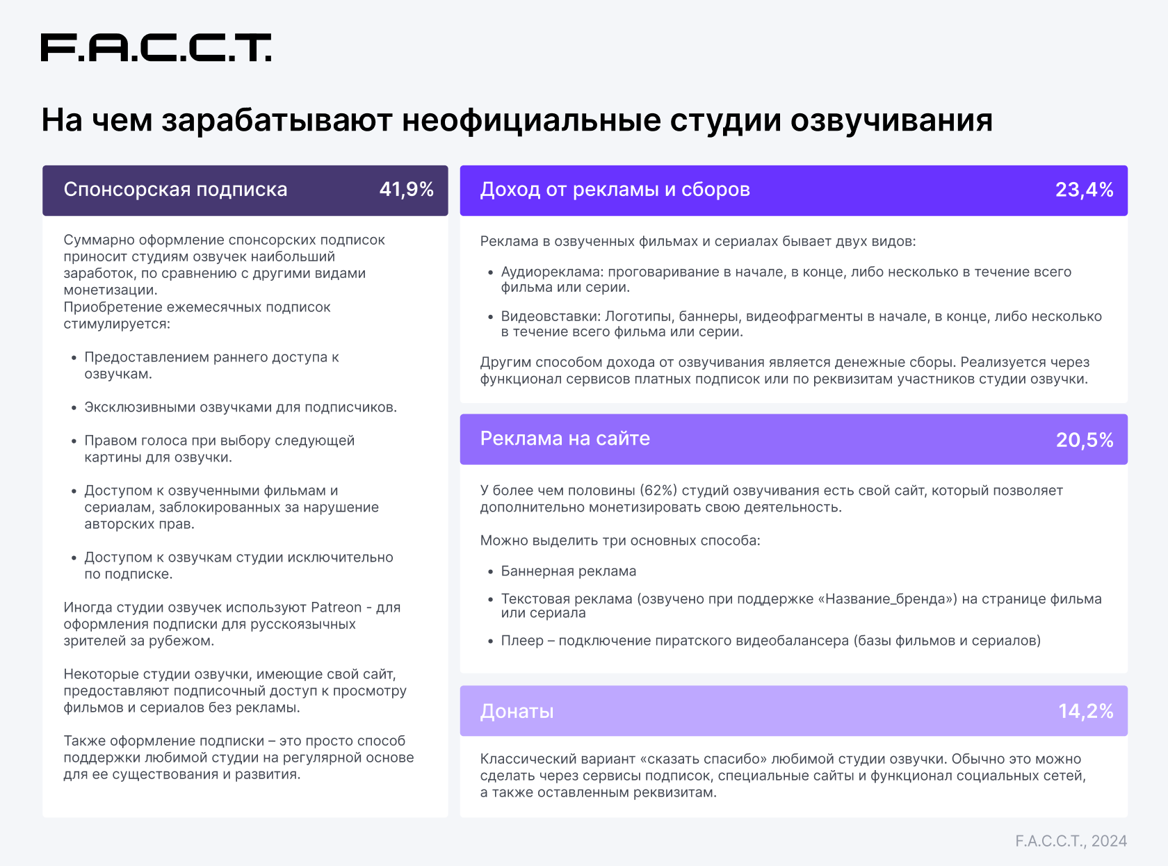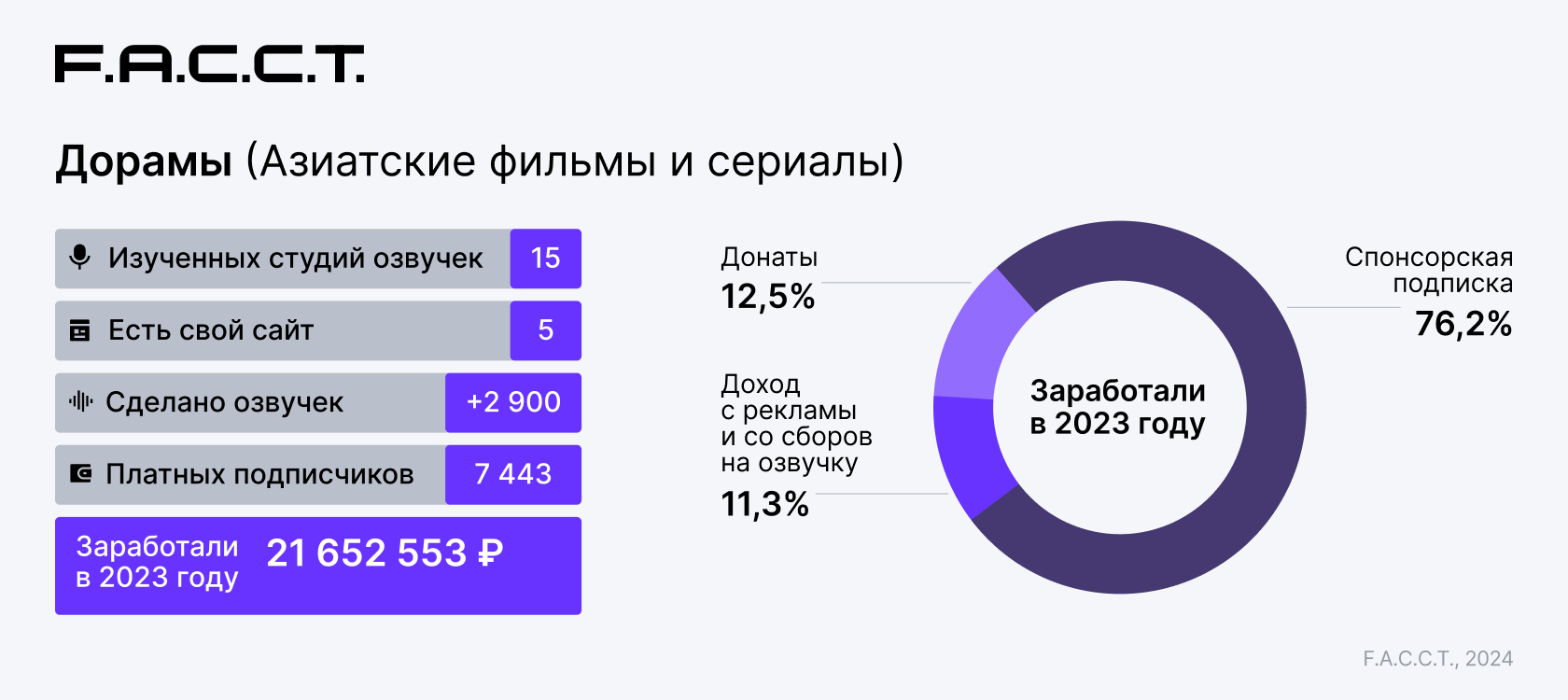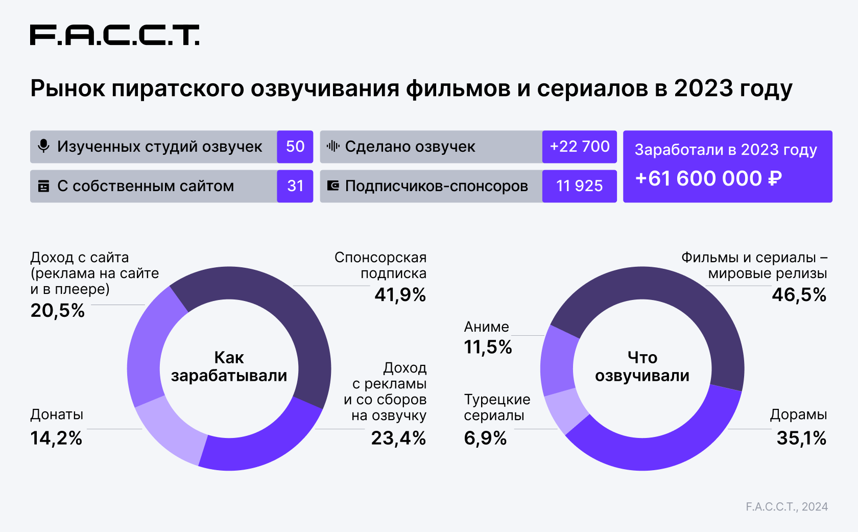 Специалисты DRP F6, занимающиеся защитой бренда от пиратского использования и несанкционированного распространения уникального цифрового контента, изучили 50 студий озвучивания, которые были активны на протяжении 2023 года, монетизировали свою озвучку и имели отношение к индустрии онлайн-пиратства. Студии занимаются неофициальным переводом и озвучиванием фильмов, сериалов, в том числе отдельных популярных в России жанров: турецких сериалов (дизи), азиатских сериалов (дорам) и мультипликации (аниме).