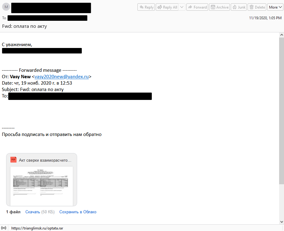 Письмо, которое было отправлено с почты vasy2020new@yandex[.]ru 19 ноября 2020 года, включало изображение с ссылкой для загрузки архива: hxxps://trianglimsk[.]ru/optata.rar. Загруженный архив oplata.rar (SHA1: e961421fdc72cd6abe737ed3d9db5ed5cb311ec4) содержал исполняемый файл oplata.scr (SHA1: 4812625252165982da23875c469666425ce4866e), который является вредоносным ПО WarzoneRAT (также — Ave Maria).