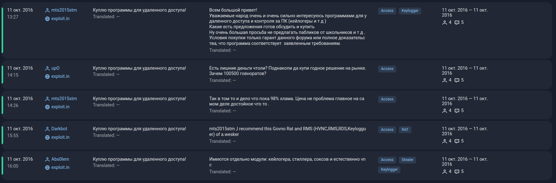 В дальнейшем он активно участвовал в обсуждениях на форуме exploit.in вопросов, связанных с покупкой или продажей вредоносного ПО, построенного на основе легитимных инструментов удаленного управления, таких как RMS или TeamViewer.