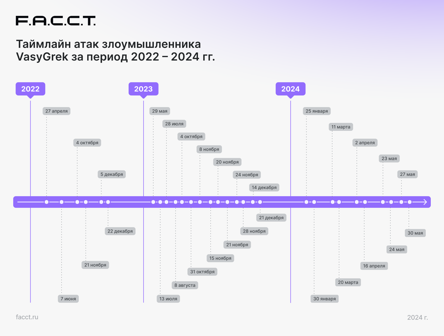 Рис. 1 — Таймлайн атак злоумышленника VasyGrek за период 2022-2024 гг.