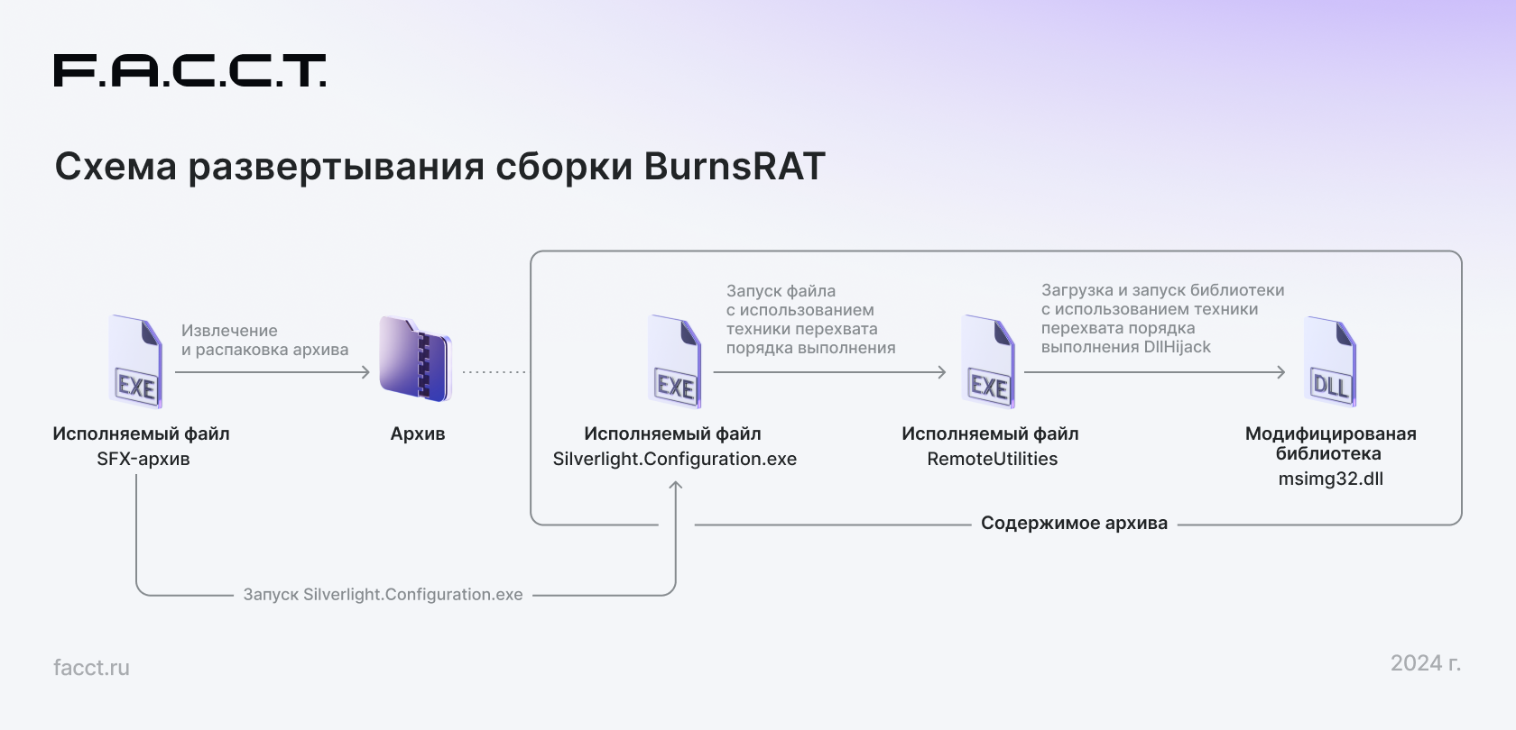 Как мы указали на схеме выше, VasyGrek может использовать PureCrypter.Downloader несколько раз для запуска дополнительных вредоносных модулей в зараженной системе. В абсолютном большинстве атак финальной, обнаруженной нами стадией цепочки заражения является инфицированная модификация ПО удаленного управления системой Remote Utilities (aka RMS). Данное вредоносное ПО классифицируется специалистами компании F6 как BurnsRAT. Подробнее об указанном инструменте мы расскажем в разделе BurnsRAT.
