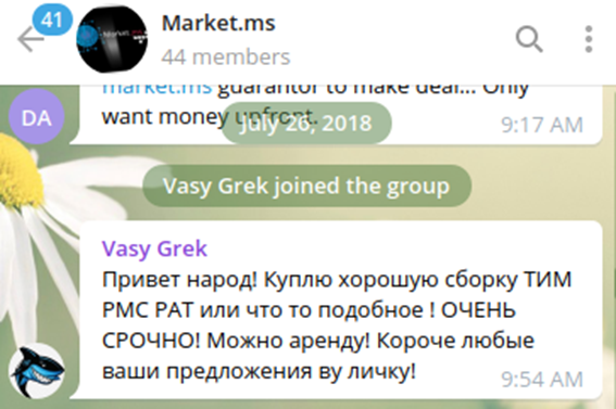 Рис. 11 — Сообщение злоумышленника VasyGrek в телеграм-чате Market.ms