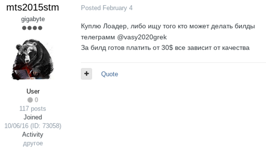 Последнее сообщение пользователя mts2015stm было отправлено 4 февраля 2021 года на форуме exploit.in в собственную тему «Куплю Лоадер, либо ищу того кто может делать билды».