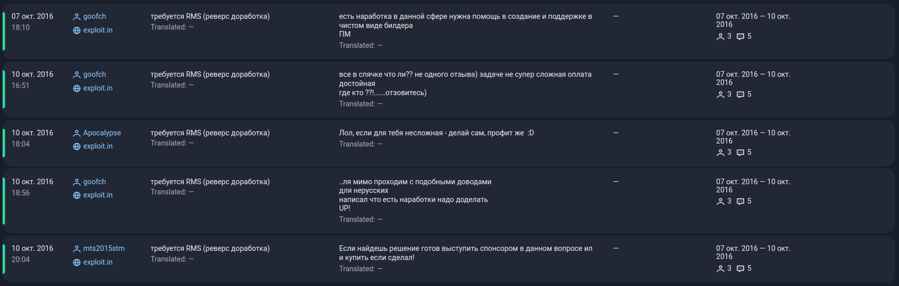 Рис. 13 — Сообщения в теме «требуется RMS (реверс доработка)» на форуме exploit.in