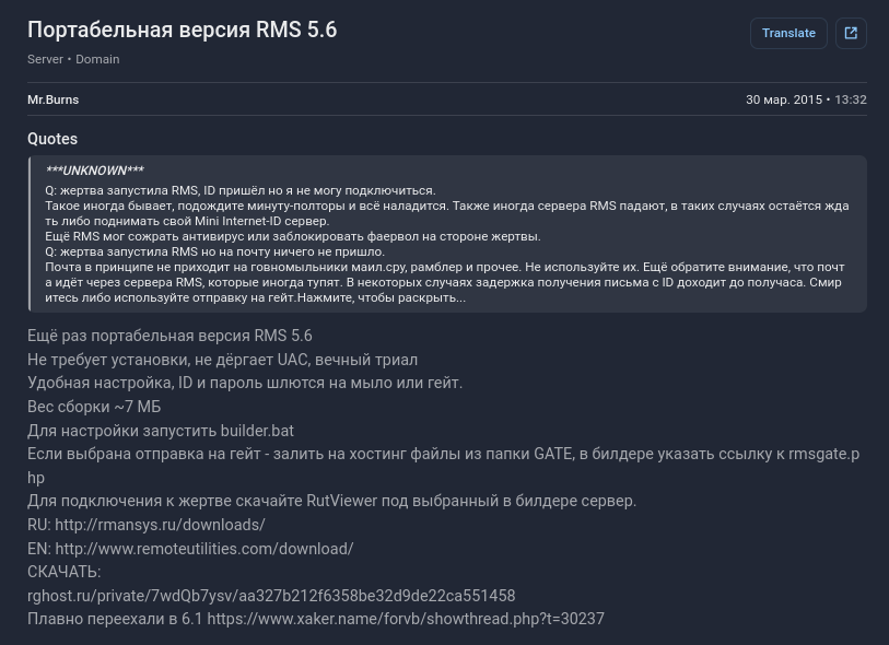 3 сентября 2011 года другим пользователем форума xaker.name была создана тема «RMS 5.1 c отправкой ID и pass на почту» (https://xak[.]guru/threads/23230/) о сборке средства удаленного управления RMS 5.1 с возможностью скрытой работы. Тема получила большой отклик от участников форума и набрала более 1900 комментариев. Именно благодаря этой теме Mr.Burns заинтересовался разработкой троянов удаленного доступа и в ней же с июня 2013 года начал публикацию собственных сборок RMS. В течение года он публично занимался изменением и улучшением качества ВПО.
