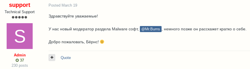 Со временем пришло и признание со стороны сообщества вирусописателей. 19 марта 2021 года пользователь Mr.Burns был назначен модератором раздела Malware на теневом форуме exploit.in.