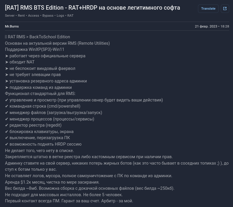 В результате поиска по псевдониму mrburns было обнаружено несколько аккаунтов с почти таким же именем (Mr.Burns) на различных теневых форумах. Как показало дальнейшее расследование, все они принадлежат одному и тому же разработчику вредоносного ПО. Mr.Burns является истинным долгожителем дарквеба: первые его сообщения на теневых форумах датируются 2010 годом. Созданные Mr.Burns программы в большинстве своем основываются на легитимных средствах удаленного управления, таких как TeamViewer, RMS (Remote Utilities), LiteManager и др.