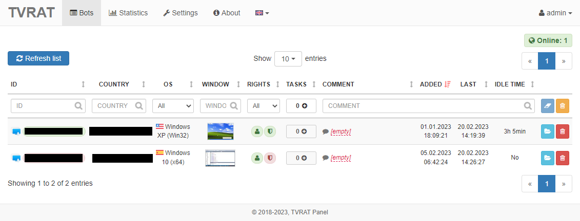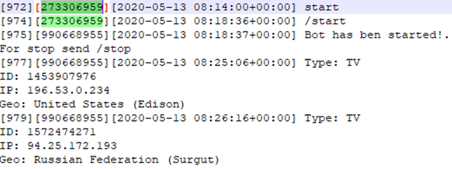 В ходе дальнейшего исследования были получены сообщения, отправленные и полученные этим ботом. Взаимодействие с ботом осуществляли только два пользователя: @vasy2020grek (ID 273306959) и @goga_seksi (ID 295688215). Судя по полученным сообщениям, после отправки боту стандартной команды /start пользователи получали от него данные с зараженных устройств, содержащие IP-адреса жертв и ID для подключения. В логах содержится поле Type:, которое имеет два значения: TV и RMS, в зависимости от используемой вариации вредоносного ПО BurnsRAT.