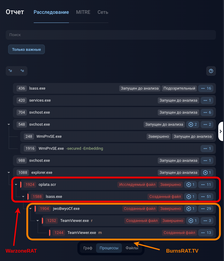 Рис. 7 — Список процессов, в которых фигурируют WarzoneRAT и BurnsRAT