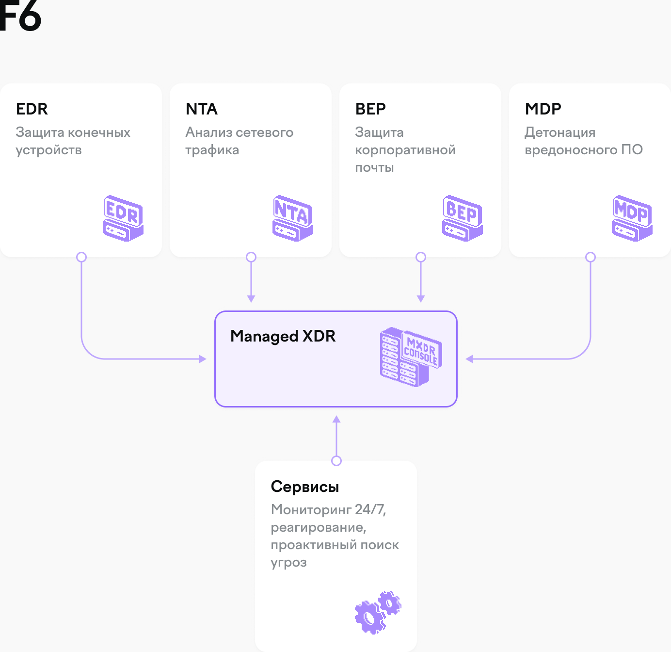 F6 Managed XDR помогает противостоять программам-шифровальщикам, троянам, шпионам, бэкдорам, вредоносным скриптам и скрытым каналам передачи данных внутри и за пределами защищенного периметра — угрозам, которые могут вывести бизнес из строя.