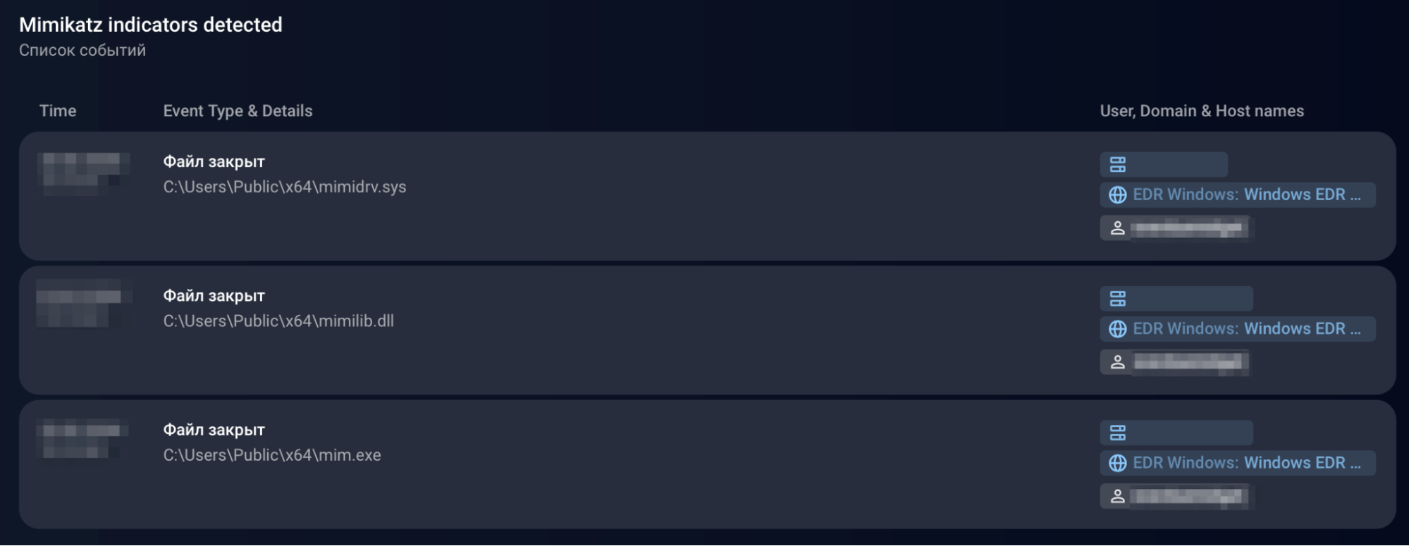 Рис. 8. Индикаторы, свидетельствующие об активности утилиты Mimikatz на скомпрометированном хосте.