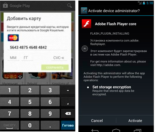 Позже злоумышленники начали собирать данные пластиковых карт, для чего использовали фишинговые страницы в сети Интернет. Вредоносная программа показывала поверх окна Google Play свое окно с предложением ввести данные банковской карты, как показано на Рисунке ниже. После того, как пользователь ввел данные карты, они немедленно передавались на сервер злоумышленника.