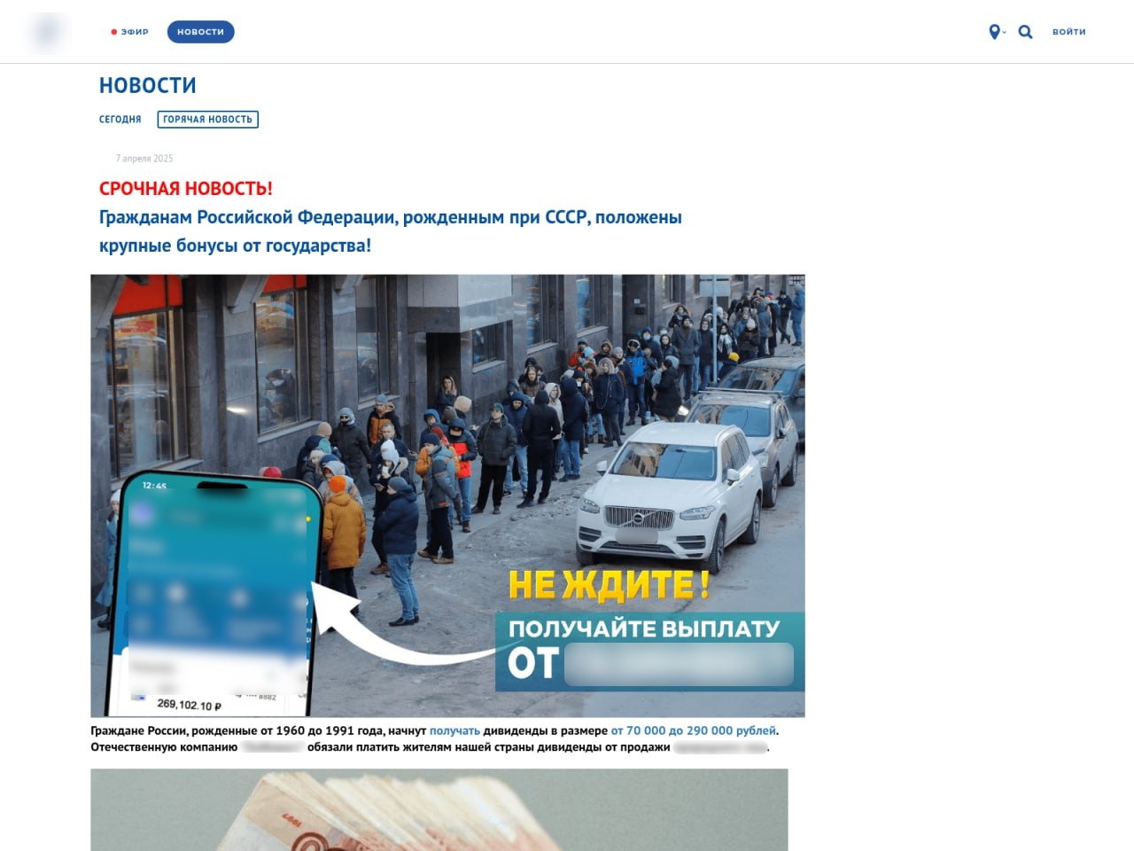 Аналитики F6 отмечают: киберпреступники используют сценарий инвестиционного мошенничества, нацеленный на «рожденных в СССР», уже долгое время, однако постоянно меняют формат подачи ложной информации. Например, в феврале 2025 года мошенники предлагали акцию «в честь Масленицы» от имени известной энергетической компании. А в апреле 2025 года в интернете появились мошеннические сайты с фейковыми новостями про несуществующие дивиденды, внешне копирующие сайты известных российских СМИ.