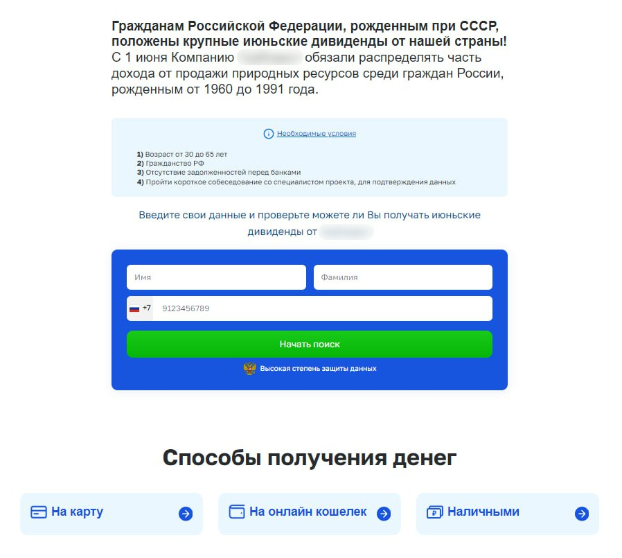 Злоумышленники создали 47 сайтов, на которых размещены такие ложные сообщения. Посетителям этих сайтов предполагают указать свои данные – имя, фамилию и телефон – под предлогом проверки возможности получения несуществующих дивидендов в сумме до 290 тысяч ₽. В числе необходимых условий, которые якобы дают право на получение дохода от продажи природных ресурсов, указаны возраст от 30 до 65 лет, отсутствие задолженностей перед банками и «собеседование со специалистом проекта».