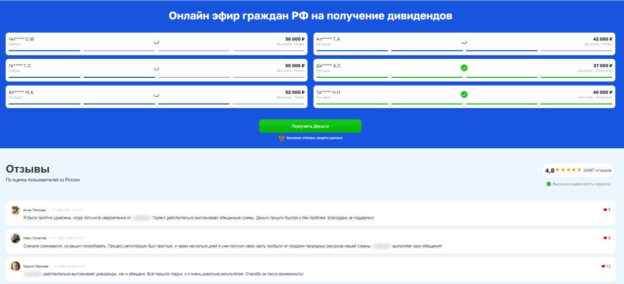 Мошенники пытаются вызвать доверие к ложным обещаниям «дивидендов», публикуя на фальшивых сайтах сообщения с суммами, которые якобы выплатили получателям прямо сейчас, а также фейковые отзывы.