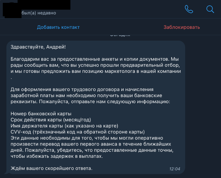 Скам. Злоумышленники под видом работодателей размещают объявления о вакансиях, под предлогом проверки запрашивают у кандидатов копии документов, а затем просят прислать реквизиты банковских карт, якобы для того, чтобы в дальнейшем перечислять на них зарплату.
