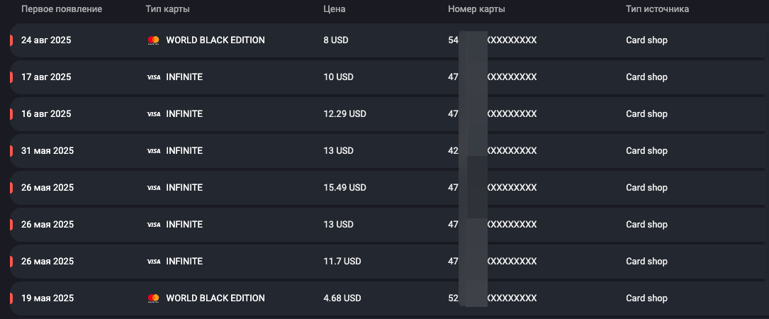 Полученные данные — 4500 реквизитов платежных карт, которые обнаружены с октября 2024 года по октябрь 2025-го — примерно на 53% больше, чем за предыдущий аналогичный период, и в 2,3 раза больше, чем за период с октября 2022 года по октябрь 2023-го. Из этого количества данные 2189 карт были зафиксированы в продаже на теневых площадках.