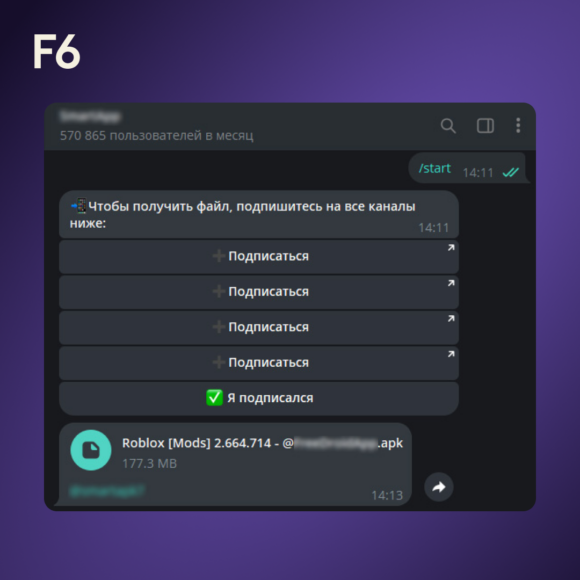 Аналитики департамента защиты от цифровых рисков (Digital Risk Protection) компании F6 обнаружили Telegram-каналы, которые предлагают пользователям скачать моды популярных игр и приложения. Например, канал «Роблокс Моды» (245 000 подписчиков) предлагает скачать моды для Roblox («полёт», «высокий прыжок», «ходьба сквозь стены») и других игр, а также приложение TikTok без ограничений и рекламы. Пройдя по ссылке, пользователь попадает в бот, где его сначала просят подписаться на несколько Telegram-каналов, а потом предлагается скачать APK-файл. В приложении по ссылке спрятано вредоносное программное обеспечение, нацеленное на пользователей Android, которое может похищать чувствительную информацию, данные о банковских аккаунтах, логинах и паролях, а также выполнять удалённые команды и менять настройки устройства.
